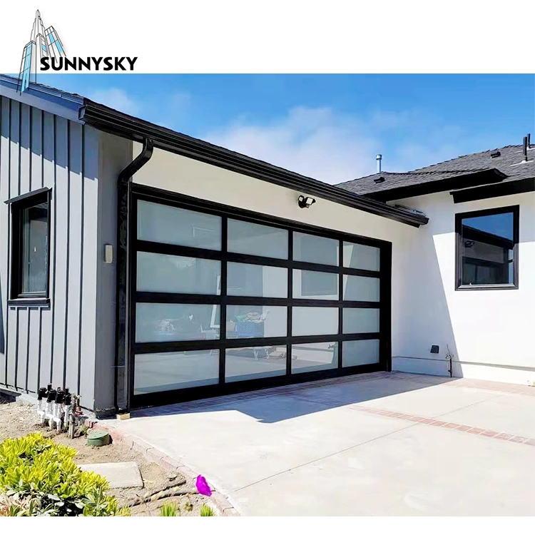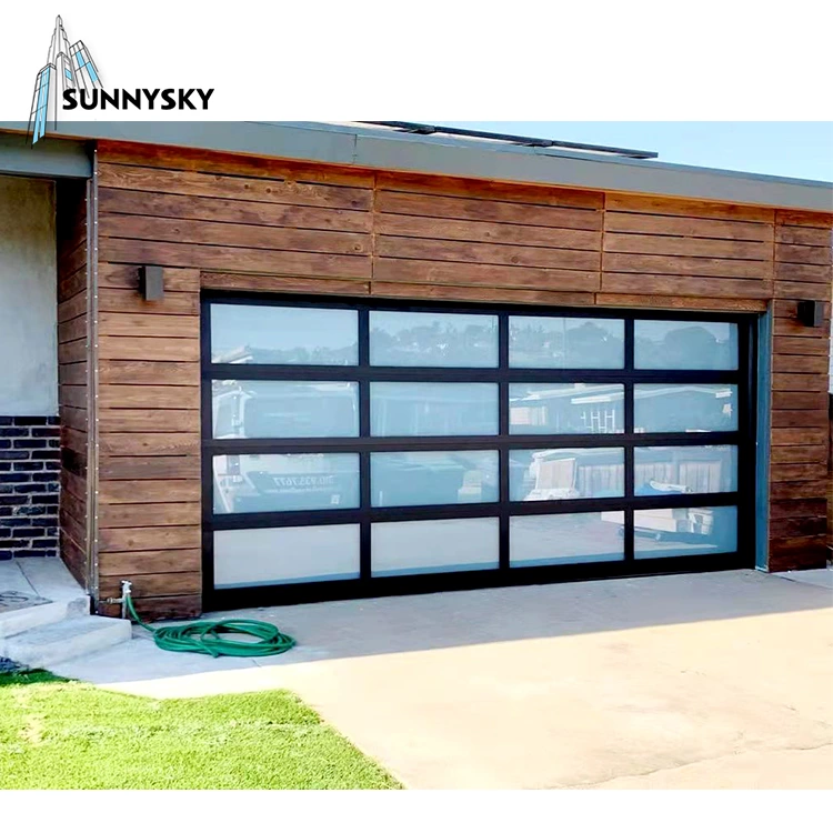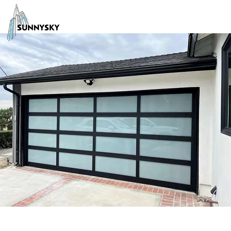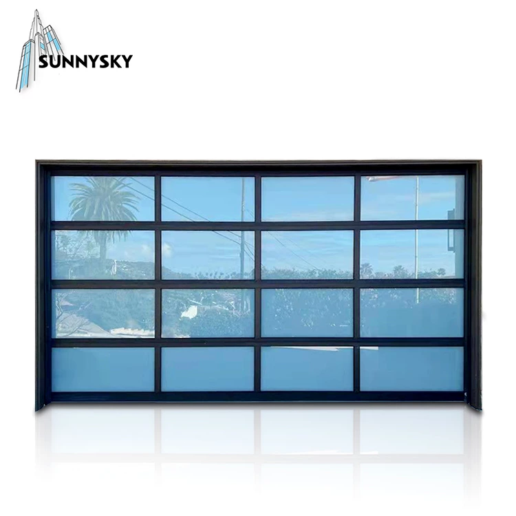 Automatic black aluminum frosted glass sectional residential garage door,Customized black glass panel aluminum frame insulated clear glass garage door,glass garag door price,all glass garage door for sale,