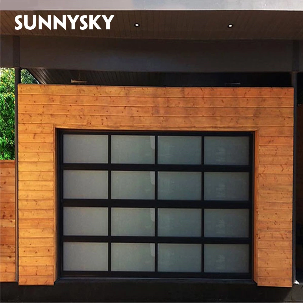 Automatic black aluminum frosted glass sectional residential garage door,Customized black glass panel aluminum frame insulated clear glass garage door,glass garag door price,all glass garage door for sale,