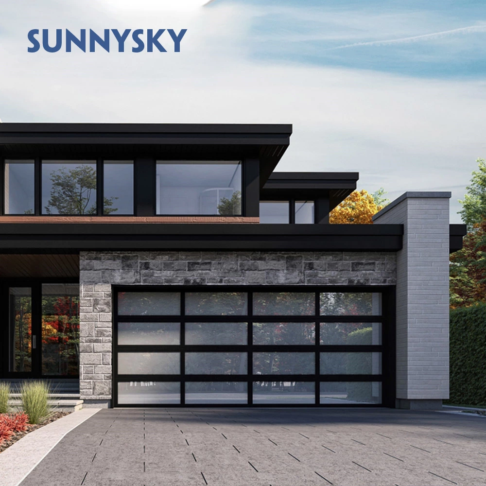 Automatic black aluminum frosted glass sectional residential garage door,Customized black glass panel aluminum frame insulated clear glass garage door,glass garag door price,all glass garage door for sale,