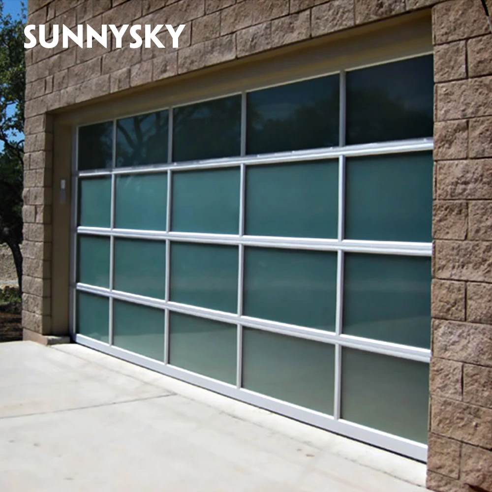 Automatic black aluminum frosted glass sectional residential garage door,Customized black glass panel aluminum frame insulated clear glass garage door,glass garag door price,all glass garage door for sale,